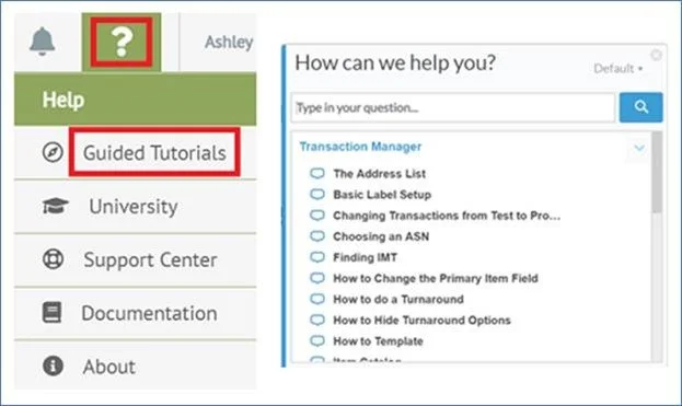 Once logged into the Transaction Manager Foundry portal, click on the question mark icon in the upper right-hand corner, and click on Guided Tutorials. In the pop-up window, search & complete the following quick tutorials: